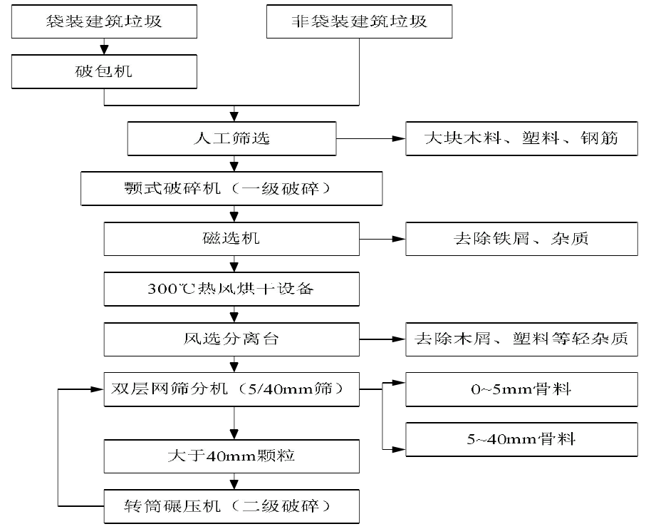 如何提高建筑垃圾的資源化利用程度,需要對建筑垃圾進行加工處理以達到再生利用的目的。對于主要成分為混凝土塊、磚塊的這類建筑垃圾制成再生產品之前需要對建筑垃圾進行預處理:粗分、破碎、分選。