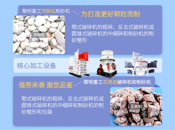 首先河卵石原料先由顎式破碎機進行粗碎處理,將大石塊的河卵石破碎成小石塊,達到中、細碎入料要求即可。然后將顎式破碎機成品輸送至圓錐破碎機或反擊破碎機中進行細碎處理,破碎成5公分左右的小石子,再用震動篩篩分后進入下一道工序。
